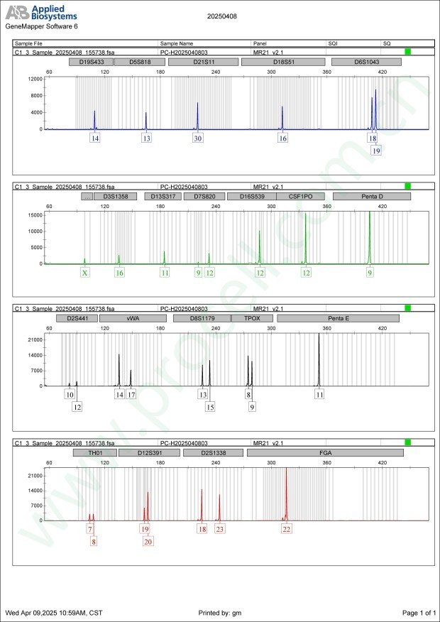 Amelogenin X CSF1PO 12 D2S1338 18,23 D3S1358 16 D5S818 13 D7S820 9,12 D8S1179 13,15 D13S317 11 D16S539 12 D18S51 16 D19S433 14 D21S11 30 FGA 22 PentaD 9 PentaE 11 TH01 7,8 TPOX 8,9 vWA 14,17 D6S1043 18,19 D12S391 19,20 D2S441 10,12  -