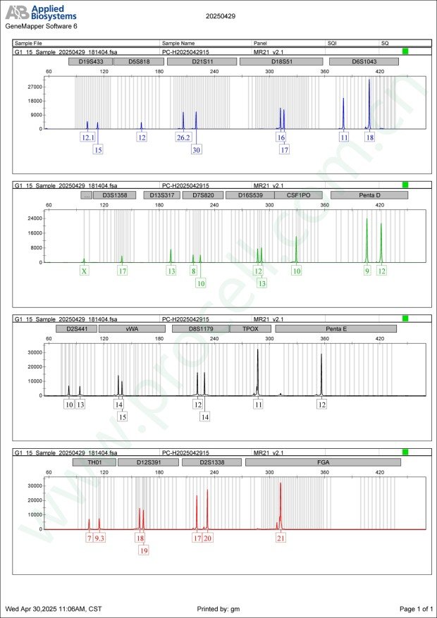 STR位点信息Amelogenin X CSF1PO 10 D2S1338 17,20 D3S1358 17 D5S818 12 D7S820 8,10 D8S1179 12,14 D13S317 13 D16S539 12,13 D18S51 16,17 D19S433 12.1,15 D21S11 26.2,30 FGA 21 PentaD 9,12 PentaE 12 TH01 7,9.3 TPOX 11 vWA 14,15 D6S1043 11,18 D12S391 18,19 D2S441 10,13