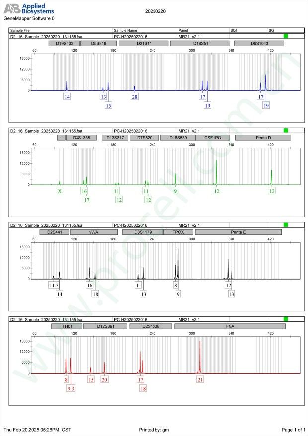 Amelogenin X CSF1PO 12 D2S1338 17,18 D3S1358 16,17 D5S818 13,15 D7S820 11,12 D8S1179 11,13 D13S317 11,12 D16S539 9 D18S51 17,19 D19S433 14 D21S11 28 FGA 21 PentaD 12 PentaE 12,13 TH01 8,9.3 TPOX 8,9 vWA 16,18 D6S1043 17,19 D12S391 15,20 D2S441 11.3,14  -