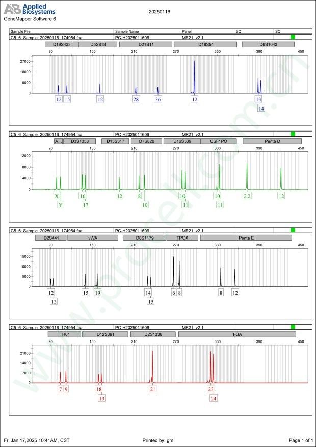 Amelogenin X, Y CSF1PO 10,11 D2S1338 21 D3S1358 16,17 D5S818 12 D7S820 8,10 D8S1179 14,15 D13S317 12 D16S539 10,11 D18S51 12 D19S433 12,15 D21S11 28,36 FGA 23,24 PentaD 2.2,12 PentaE 8,12 TH01 7,9 TPOX 6,8 vWA 15,19 D6S1043 13,14 D12S391 18,19 D2S441 12,13 -