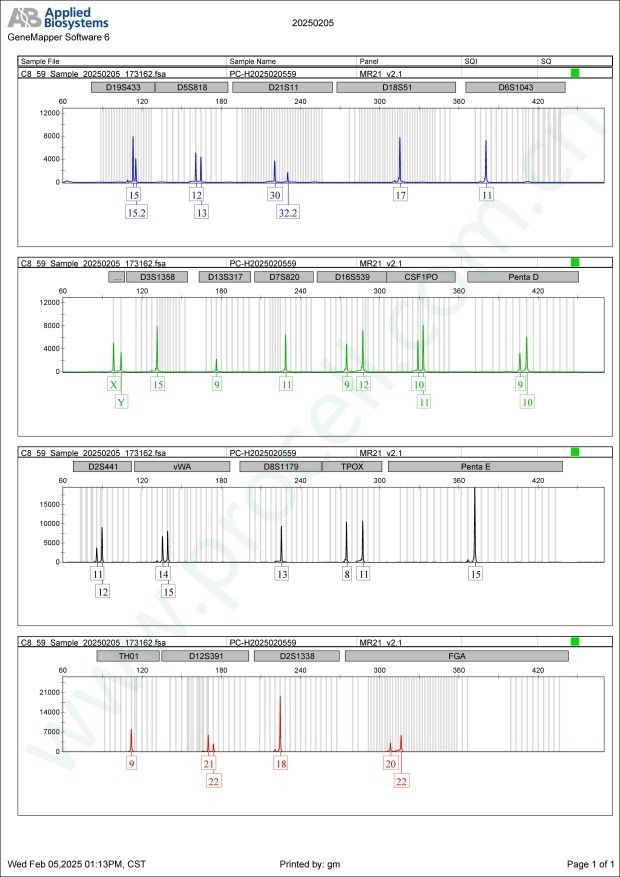 Amelogenin X,Y CSF1PO 10,11 D2S1338 18 D3S1358 15 D5S818 12,13 D7S820 11 D8S1179 13 D13S317 9 D16S539 9,12 D18S51 17 D19S433 15,15.2 D21S11 30,32.2 FGA 20,22 PentaD 9,10 PentaE 15 TH01 9 TPOX 8,11 vWA 14,15 D6S1043 11 D12S391 21,22 D2S441 11,12 -