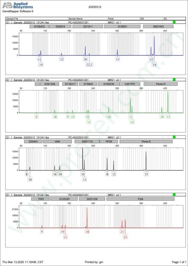 Amelogenin X CSF1PO 11,12 D2S1338 18 D3S1358 18 D5S818 12 D7S820 10,11 D8S1179 10,11 D13S317 9,12 D16S539 10 D18S51 13 D19S433 13,14 D21S11 30,32.2 FGA 21,23 PentaD 10,13 PentaE 15 TH01 9 TPOX 8,12 vWA 16,19 D6S1043 12,14 D12S391 19,21 D2S441 8,10 -
