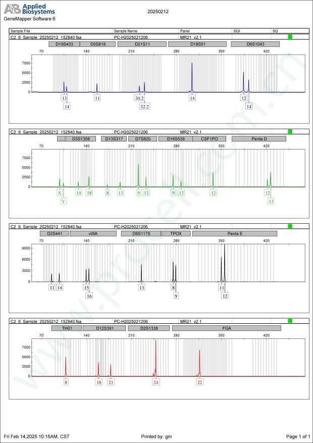Amelogenin X, Y CSF1PO 12 D2S1338 24 D3S1358 14,18 D5S818 11 D7S820 9,12 D8S1179 13 D13S317 8,13 D16S539 9,12 D18S51 14 D19S433 13,14 D21S11 30.2,32.2 FGA 22 PentaD 12,13 PentaE 11,12 TH01 8 TPOX 8,9 vWA 15,16 D6S1043 12,14 D12S391 18,23 D2S441 11,14 -