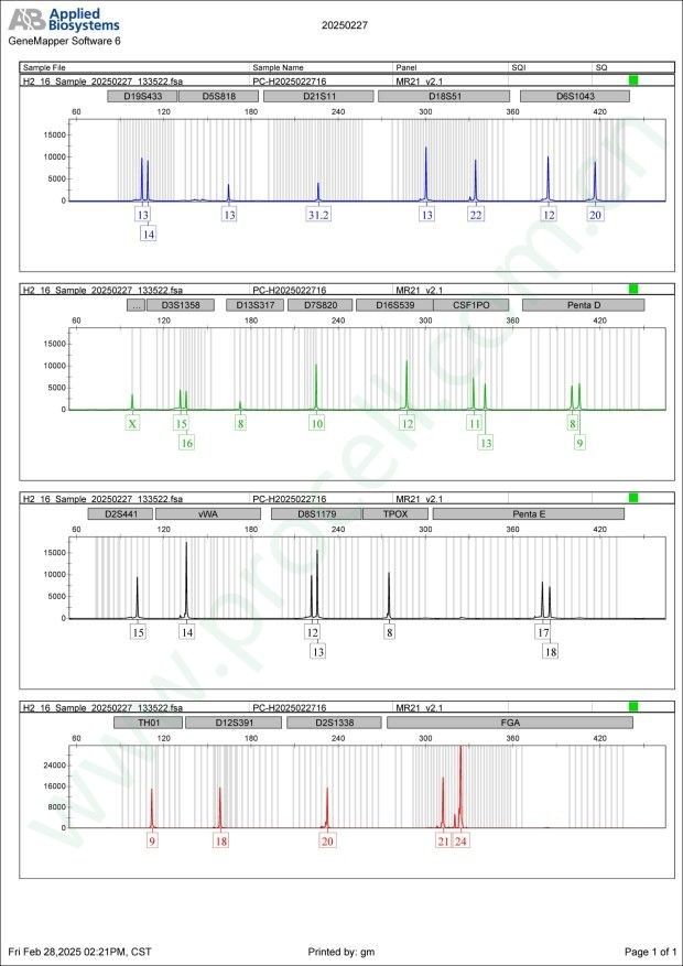 STR位点信息Amelogenin X CSF1PO 11,13 D2S1338 20 D3S1358 15,16 D5S818 13 D7S820 10 D8S1179 12,13 D13S317 8 D16S539 12 D18S51 13,22 D19S433 13,14 D21S11 31.2 FGA 21,24 PentaD 8,9 PentaE 17,18 TH01 9 TPOX 8 vWA 14 D6S1043 12,20 D12S391 18 D2S441 15