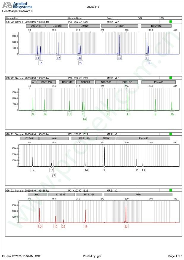Amelogenin X CSF1PO 11 D2S1338 19 D3S1358 14 D5S818 12 D7S820 9,10 D8S1179 14 D13S317 12 D16S539 11 D18S51 16 D19S433 14,16 D21S11 28,29 FGA 25 PentaD 8,16 PentaE 12,15 TH01 9.3 TPOX 8 vWA 16,17 D6S1043 11,12 D12S391 17,22 D2S441 14  -