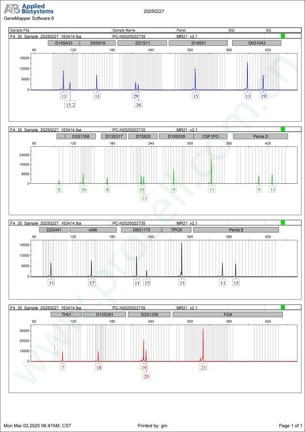 Amelogenin X CSF1PO 11 D2S1338 19,20 D3S1358 16 D5S818 11 D7S820 10,11 D8S1179 11,15 D13S317 8 D16S539 9 D18S51 15 D19S433 13,15.2 D21S11 29,30 FGA 23 PentaD 9,13 PentaE 11,15 TH01 7 TPOX 11 vWA 17 D6S1043 13,19 D12S391 18 D2S441 11  -
