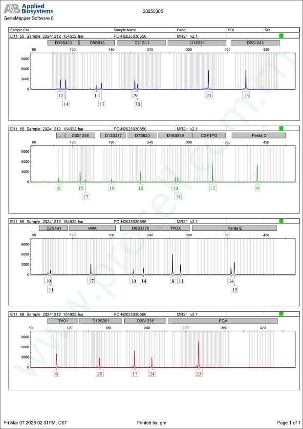 Amelogenin X CSF1PO 12 D2S1338 17,24 D3S1358 15,17 D5S818 11,13 D7S820 10 D8S1179 10,14 D13S317 10 D16S539 10,11 D18S51 21 D19S433 12,14 D21S11 29,30 FGA 23 PentaD 9 PentaE 14,15 TH01 6 TPOX 8,11 vWA 17 D6S1043 13 D12S391 20 D2S441 10,11 -