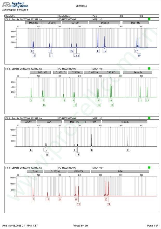 Amelogenin X CSF1PO 10,11 D2S1338 19,21 D3S1358 15,16 D5S818 10,11 D7S820 9,10 D8S1179 13,15 D13S317 13 D16S539 13,14 D18S51 11,16 D19S433 12,13 D21S11 29,32.2 FGA 22,24 PentaD 11,15 PentaE 17 TH01 7 TPOX 8 vWA 15,16 D6S1043 17,19 D12S391 15,24 D2S441 14 -