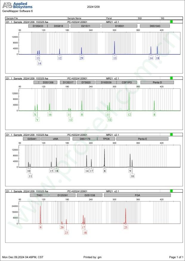 Amelogenin X, Y CSF1PO 12 D2S1338 17,18 D3S1358 16 D5S818 12 D7S820 8 D8S1179 14,17 D13S317 11,12 D16S539 11,12 D18S51 13 D19S433 13,14 D21S11 29 FGA 25 PentaD 8 PentaE 9,10 TH01 9 TPOX 8 vWA 15,18 D6S1043 14,18 D12S391 20,23 D2S441 10,11  -