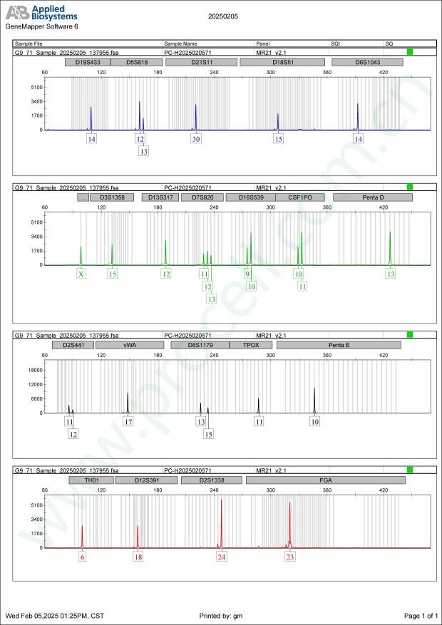 Amelogenin X CSF1PO 10,11 D2S1338 24 D3S1358 15 D5S818 12,13 D7S820 11,12,13 D8S1179 13,15 D13S317 12 D16S539 9,10 D18S51 15 D19S433 14 D21S11 30 FGA 23 PentaD 13 PentaE 10 TH01 6 TPOX 11 vWA 17 D6S1043 14 D12S391 18 D2S441 11,12 -