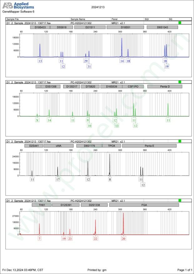 Amelogenin X CSF1PO 11,12 D2S1338 22 D3S1358 14 D5S818 11,12 D7S820 9,10 D8S1179 12 D13S317 11 D16S539 12,13 D18S51 14,18 D19S433 13 D21S11 29,31 FGA 20 PentaD 11 PentaE 11,12 TH01 7 TPOX 8 vWA 17 D6S1043 18,19 D12S391 19,23 D2S441 11 -