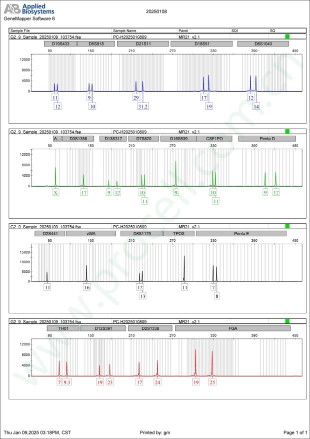 Amelogenin X CSF1PO 10,11 D2S1338 17,24 D3S1358 17 D5S818 9,10 D7S820 10,11 D8S1179 12,13 D13S317 9,12 D16S539 9 D18S51 17,19 D19S433 11,12 D21S11 29,31.2 FGA 19,25 PentaD 9,12 PentaE 7,8 TH01 7,9.3 TPOX 11 vWA 16 D6S1043 12,14 D12S391 19,23 D2S441 11  -